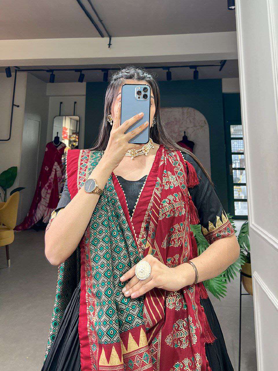 Elegant Tussar Silk Lehenga Set featuring vibrant Patola print with foil work. Includes a stitched lehenga with can-can, unstitched blouse, and printed dupatta. Perfect for festive and wedding occasions.